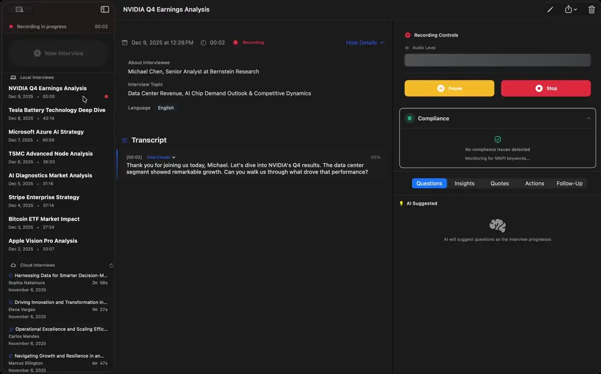 The InsightAgent backend may relay your audio to third-party transcription services (such as AssemblyAI) for processing. This is handled server-side and governed by the platform Privacy Policy and Terms of Service.